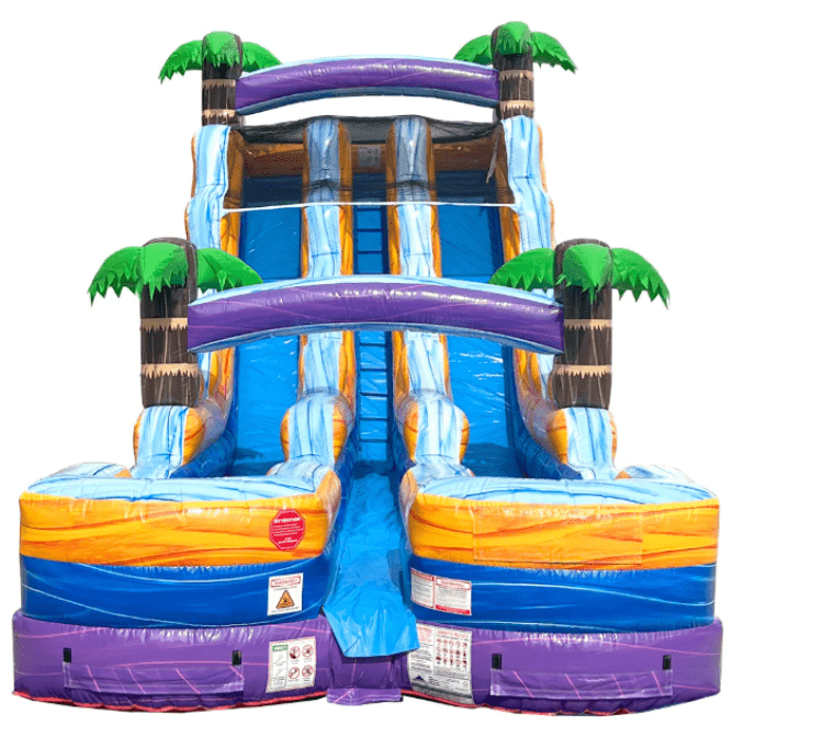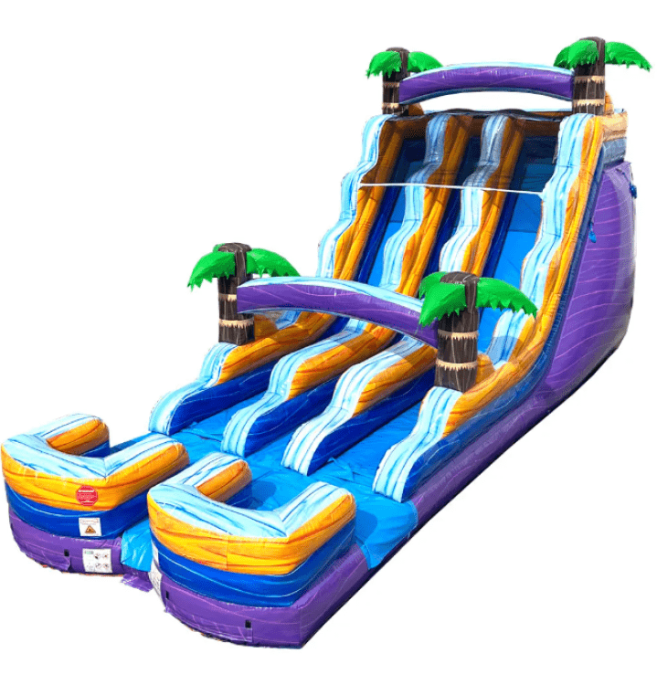 Bring double the excitement to your next party or event with our 18' Double Lane Tropical Rush Waterslide! This eye-catching inflatable stands 18 feet tall and stretches 35 feet long, giving riders a fast, refreshing race down two side-by-side lanes. Its vibrant, gender-neutral colors make it a perfect fit for birthdays, school events, church gatherings, field days, and summer celebrations of all kinds.